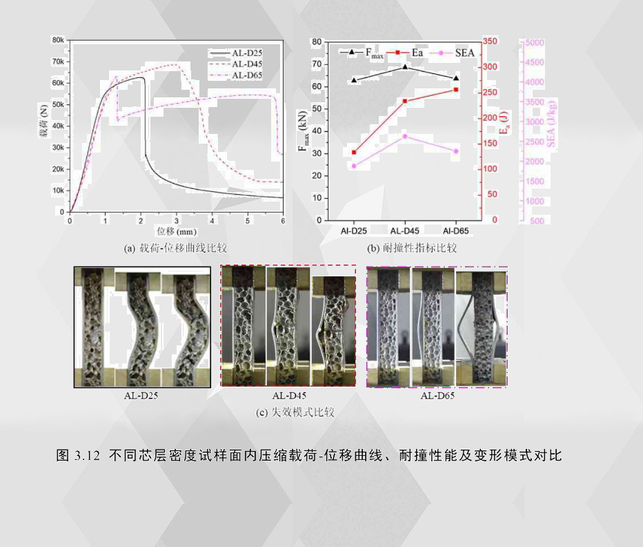 為了分析泡沫芯層密度的影響,選取芯層密度為0.25g/cm3,0.45g/cm3和0.65g/cm3的鋁合金夾層結(jié)構(gòu)作為研究對象。圖3.12(a)和(c)為三種試件的載荷-位移曲線和變形過程的比較,從圖中可以看出,其載荷-位移曲線的相似性相較大。其中AL-D25和AL-D45在第一二階段的變化趨勢基本一致,區(qū)別在于前者出現(xiàn)整體屈曲,并且芯層剪切破壞明顯,載荷出現(xiàn)斷崖式下降;而后者的失效模式以面板屈曲為主,芯層并未出現(xiàn)明顯芯層破裂,所以試件整體的仍具備相對穩(wěn)定的承載能力,雖說載荷也出現(xiàn)大幅度下降,但其下降的坡度遠沒有前者陡。對試件AL-D65而言,其載荷-位移曲線與其他兩個試件的主要差別在于第一階段和第二階段交界處附近載荷出現(xiàn)斷崖式下降,造成這種現(xiàn)象的原因是某一面板出現(xiàn)較大尺寸的屈曲,并伴隨著大面積膠層失效,此面板基本喪失了大部分承載能力,從而導(dǎo)致載荷劇減,而當另一面板再次出現(xiàn)屈曲時,載荷仍然出現(xiàn)斷崖式下降。雖然試件AL-D45也出現(xiàn)了面板屈曲現(xiàn)象,但與AL-D65不同的是,前者的兩面板幾乎同時出現(xiàn)屈曲失效,兩面板的承載能力不至于瞬間減低,雖說承載能力有所下降,但也并未出現(xiàn)斷崖式下跌,而且AL-D45的峰值載荷對應(yīng)的位移大約在3mm,比AL-D65的1.3mm更遲,這也從另一方面解釋了前者具有更大的峰值載荷。有趣的是,雖然三者曲線相差較大,但三種試件在第一階段和第二階段的斜率是旗鼓相當?shù)摹?/span>