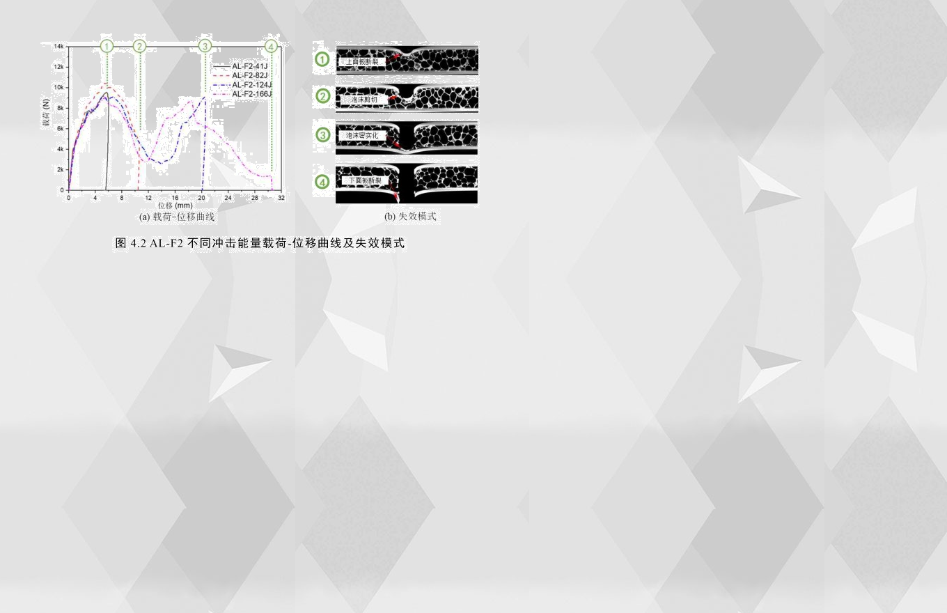 4.2為AL-F2在不同沖擊能量下的載荷-位移曲線及失效模式,AL-F2在166J沖擊能下試件完全穿透,其載荷-位移曲線有兩個峰值載荷,結合其在不同沖擊能量下最終損傷CT掃描圖,如圖4.2(b)所示,可以將結構響應分為三個階段,第一階段為沖頭接觸到上面板到抵達第一次峰值載荷,由于這個過程半球狀沖頭與面板的接觸面積不是線性增長且面板逐漸發生塑性變形,所以此階段的載荷呈非線性增長,當上面板出現裂紋時,如圖4.2(b)中①,載荷到達第一個峰值載荷;第二階段為第一次峰值載荷到第二次峰值載荷,在此階段的前半階段載荷持續下降到波谷,主要的失效模式為上面板裂紋的出現以及擴展,與此同時,泡沫芯層受到一定程度的壓潰,在第二階段的后半階段,由于泡沫鋁芯層被壓實至密實化,如圖4.2(b)中③所示,載荷再一次持續上升;第三階段即為第二次峰值載荷之后,開始于下面板出現裂紋到結構完全失去承載能力。